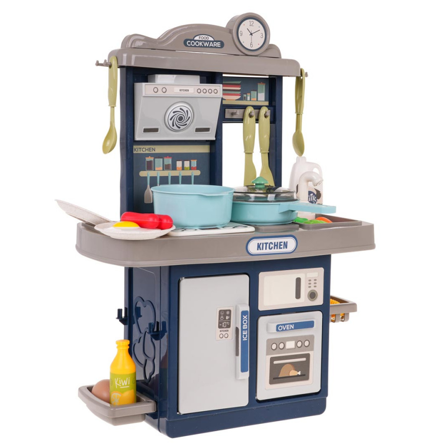 OpisKuchnia Aneks Kuchenny z Funkcją Dźwięku 28 el. Niebieska Interaktywna kuchnia z funkcją światła, dźwięku i kranikiem, z którego wydobywa się woda, a także mnóstwem akcesoriów, dla dzieci od 3-go roku życia. Kuchnia została znakomicie wykonana, z najlepszej jakości plastiku i jest w żywych kolorach zachęcających dziecko do zabawy. Na blacie kuchni znajduje się interaktywna płyta z odgłosami gotowania, smażenia i melodiami oraz podświetleniem. W zestawie mamy też atrapę piekarnika z otwieranymi drzwiczkami i atrapę lodówki z otwieranymi drzwiczkami. Cały zestaw prezentuje się znakomicie. Zabawka zasilana jest bateriami typu 3 x AA 1,5 V (brak w zestawie). Funkcje zestawu:- odpowiednia dla dzieci od 3-go roku życia,- wykonana z najlepszej jakości plastiku w żywych kolorach,- bogato wyposażona, zestaw składa się z 28 elementów,- stabilna konstrukcja,- płyta indukcyjna z podświetleniem, odgłosami smażenia, gotowania i muzyką oraz regulacją głośności,- kran z lecącą wodą (należy naciskać pompkę),- otwierany piekarnik,- otwierana lodówka,- mnóstwo akcesoriów produktów spożywczych.Wymiary- kuchnia ok. 31 cm x 45,5 cm x 15 cm,- garnek z pokrywką ok. 11 cm x 6 cm x 9 cm,- patelnia ok. 15,5 cm x 9 cm x 2,5 cm,- sztućce i chochelka ok. 10,5 cm x 1,5 cm,- talerze ok. 8 cm średnicy,- mleko ok. 7 cm x 4 cm x 2,5 cm,- sok ok. 8,5 cm x 3 cm,- jajko sadzone ok. 6 cm x 5,5 cm,- jajko na twardo ok. 4,5 cm x 3,5 cm,- kiełbaski ok. 5,5 cm x 3 cm,- ryba ok. 6 cm x 3 cm,- kukurydza ok. 6,5 cm x 2,5 cm,- sałata ok. 4,5 cm x 4,5 cm,- bakłażan ok. 6 cm x 2 cm,- marchewka ok. 5 cm x 2,5 cm,- orzeszek ok. 5 cm x 2 cm,- sałata ok. 4 cm x 2,5 cm,- opakowanie ok. 35 cm x 27,3 cm x 12,5 cm.Zawartość zestawu – kuchnia,- garnek z pokrywką,- patelnia,- 2 x talerz,- chochelka,- 3 x sztućce,- atrapy produktów spożywczych: jajko sadzone, jajko na twardo, ryba, sałata, papryka, kiełbaski, bakłażan, kukurydza, marchewka, orzeszek, mleko, sok,- naklejki dekoracyjne,- instrukcja montażu.