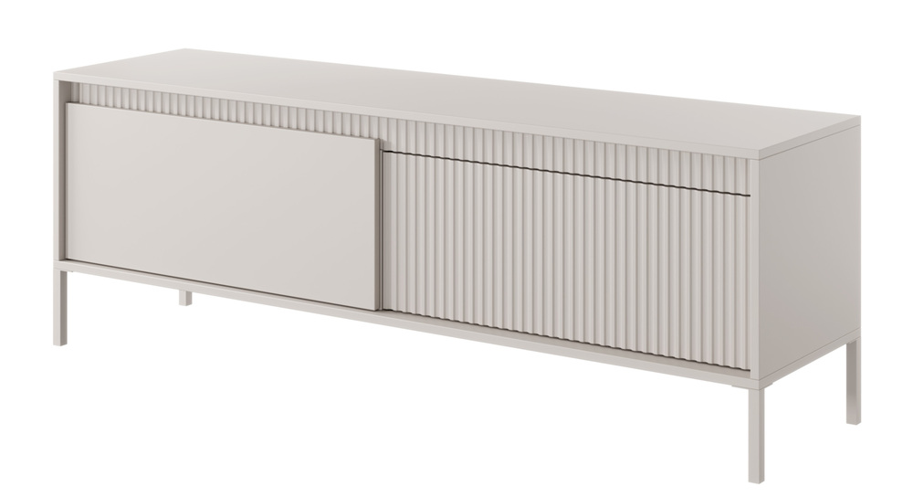 Kończysz remont i marzą Ci się nowoczesne meble do salonu, które zachwycą Twoich gości? Wybierz kolekcję Falsetto i odmień swój salon ciekawymi formami! Szafka RTV Falsetto to idealna propozycja dla ludzi ceniących ład i porządek. Szafka posiada dwie wnęki, które świetnie sprawdzą się jako miejsce na sprzęt elektroniczny, kolekcję gier czy rzadziej używaną konsole wraz z padami. Na szerokim blacie oprócz telewizora możesz postawić ulubione dekoracje lub dekoder. Przód komody prezentuje się nad wyraz stylowo, dzięki połączeniu frezowanych frontów z płaskimi drzwiami. Taki zabieg nadał całemu meblowi modnej trójwymiarowości i dekoracji. Proste, metalowe nóżki w kolorze korpusu nie obciążają konstrukcji, jednocześnie dodając funkcjonalności, ponieważ ze względu na ich wysokość, łatwo wjadą pod nie wszelkie roboty sprzątające. Mebel posiada system otwierania na klik, co pozwoliło nie zaburzać konstrukcji uchwytami. Szczegóły produktu: korpus wykonany z płyty wiórowej laminowanej w kolorze